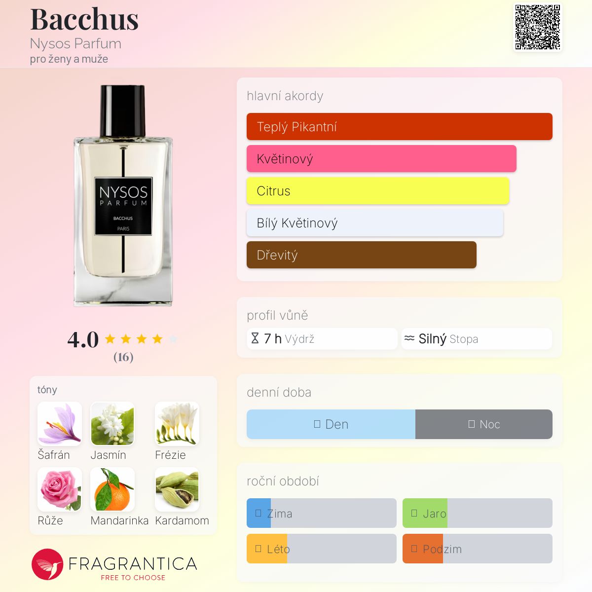 Bacchus podle Nysos Parfum je Woody Aromatic vůně pro ženy a muže. Bacchus byl/a uveden/a v roce 2023. "Nosem" za touto vůní je Alex Lee. Vrchní tóny jsou Šafrán, Mandarinka, Kardamom, Citrón a Bergamot; střední tóny jsouJasmín, Frézie, Růže a Konvalinka ; základní tóny jsou Pačuli, Santalové dřevo, Orcanox™ a Ambrarom.