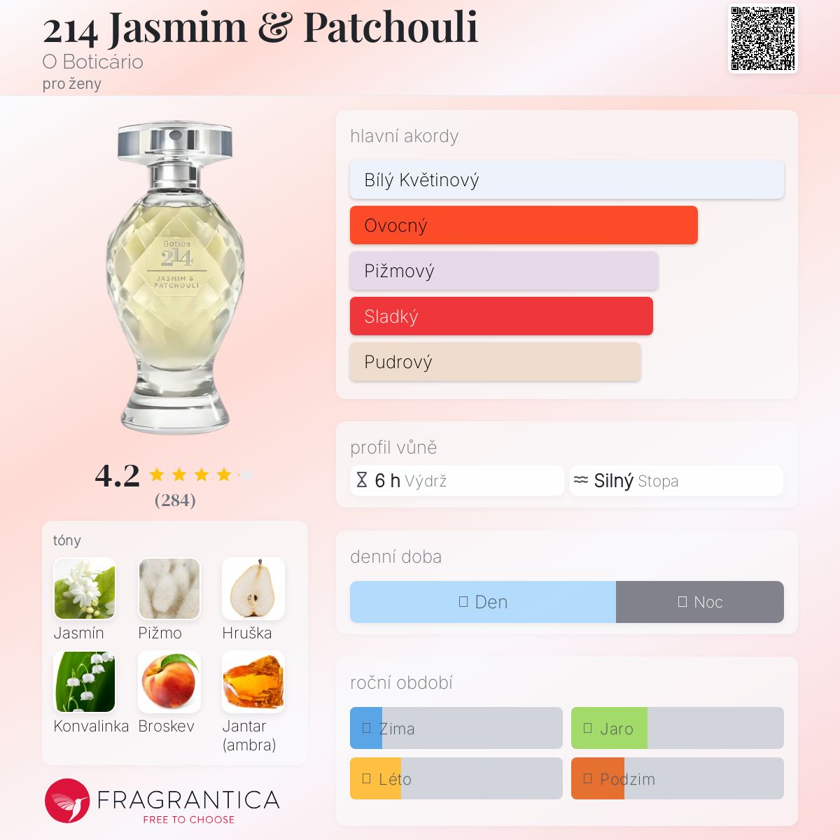 214 Jasmim & Patchouli podle O Boticário je Floral Fruity vůně pro ženy. 214 Jasmim & Patchouli byl/a uveden/a v roce 2019. "Nosem" za touto vůní je Marion Costero. Vrchní tóny jsou Hruška, Bergamot a Grapefruit; střední tóny jsouJasmín, Konvalinka, Broskev a Maliny ; základní tóny jsou Pižmo, Jantar (ambra), Pačuli a Madagaskarská vanilka.