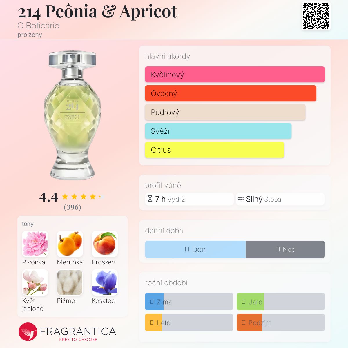 214 Peônia & Apricot podle O Boticário je Floral Fruity vůně pro ženy. 214 Peônia & Apricot byl/a uveden/a v roce 2019. "Nosem" za touto vůní je Clito Hoedicke. Vrchní tóny jsou Meruňka, Květ jabloně , Bergamot, Pomelo a Mandarinka; střední tóny jsouPivoňka, Bílá broskev, Kosatec a Liči ; základní tóny jsou Pižmo, Vanilka, Pačuli a Santalové dřevo.