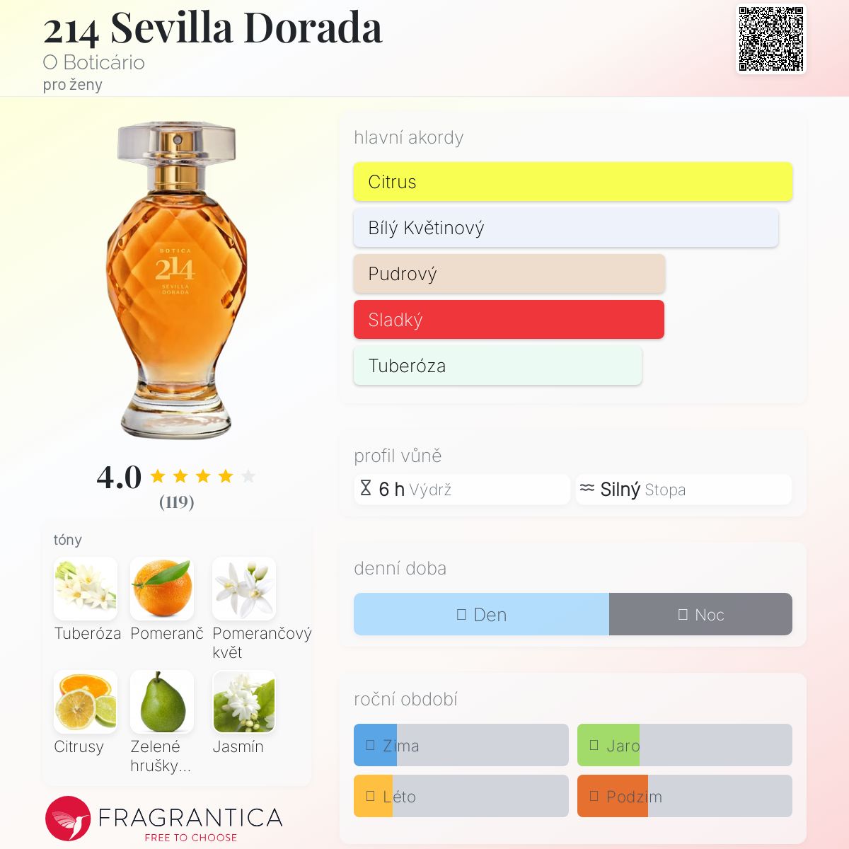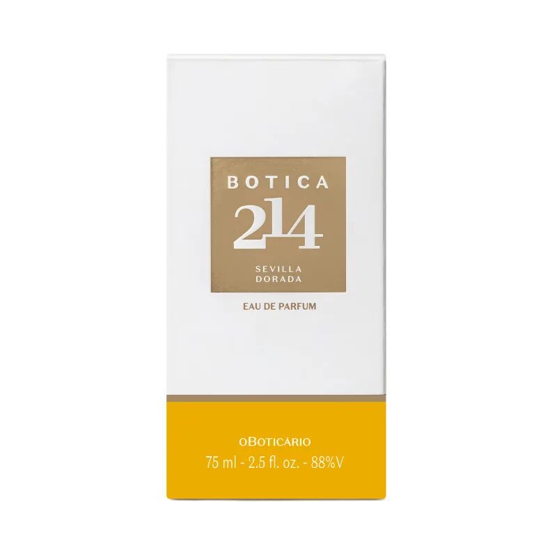 214 Sevilla Dorada podle O Boticário je Floral Fruity vůně pro ženy. Toto je nová vůně. 214 Sevilla Dorada byl/a uveden/a v roce 2025. Vrchní tóny jsou Pomeranč, Citrusy, Zelené hrušky Anjou, Zázvor, Grapefruit, Fík, Rebarbora a Elimi; střední tóny jsouTuberóza, Pomerančový květ, Jasmín, Fialka, Mimóza, Kosatec a Vonokvětka ; základní tóny jsou Jantar (ambra), Vanilka, Kumarin, Pižmo, Santalové dřevo, Cedr, Pačuli a Mech.