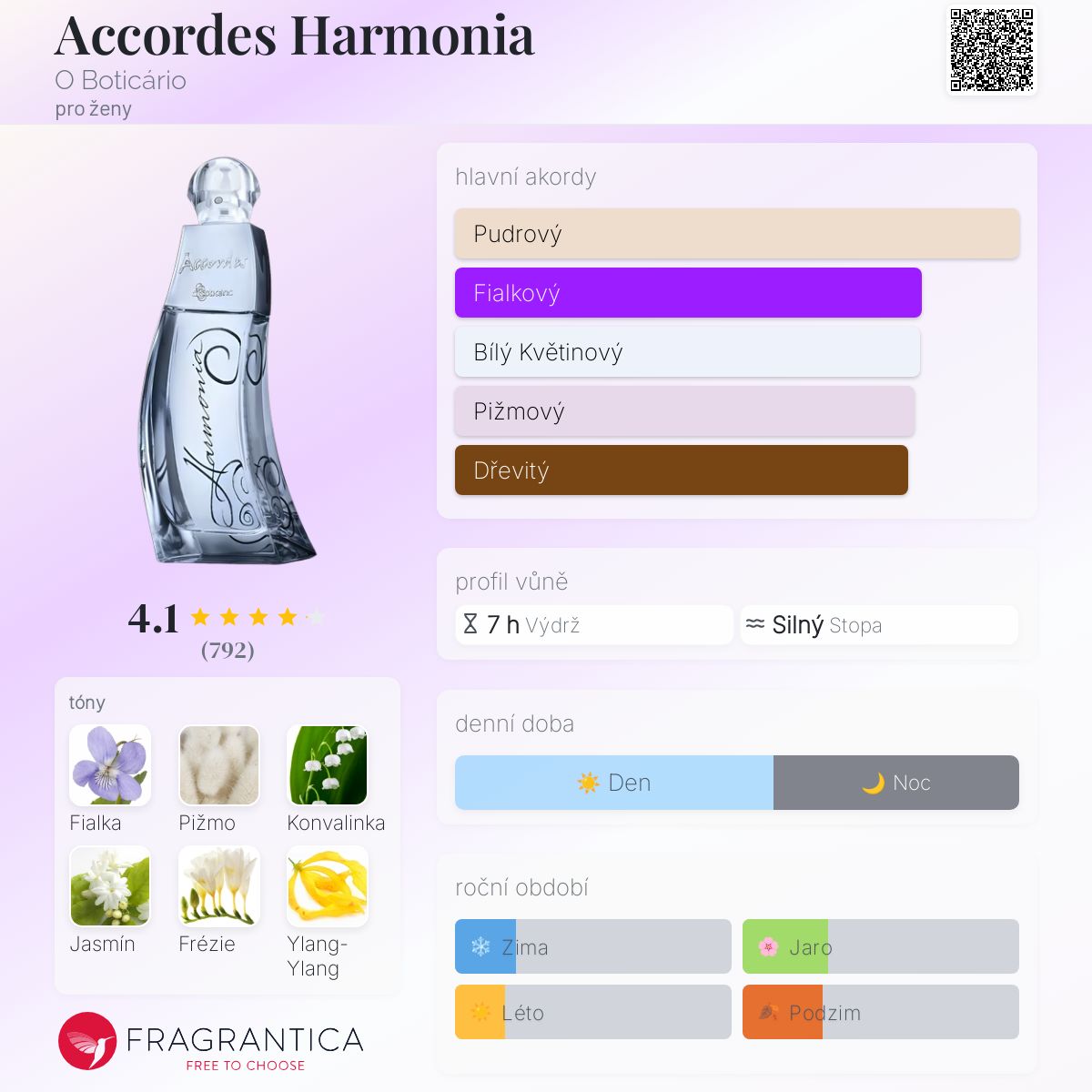 Accordes Harmonia podle O Boticário je Floral Aldehyde vůně pro ženy. Accordes Harmonia byl/a uveden/a v roce 2006. "Nosem" za touto vůní je Adilson Rato. Vrchní tóny jsou Kumquat, Petitgrain, Mandarinka a Kiwi; střední tóny jsouFialka, Konvalinka, Jasmín, Frézie, Ylang-Ylang a Andělika ; základní tóny jsou Pižmo, Fazole tonka, Santalové dřevo, Dubový mech, Jantar (ambra), Vetiver a Virginský cedr.