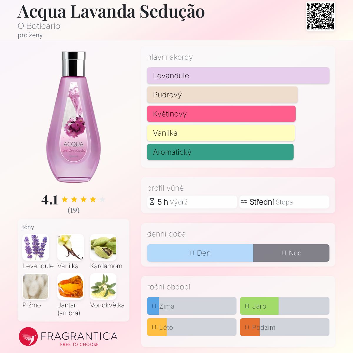 Acqua Lavanda Sedução podle O Boticário je Floral Green vůně pro ženy. Vrchní tóny jsou Levandule, Kardamom a Mandarinka; střední tóny jsouVonokvětka, Růže, Brambořík a Konvalinka ; základní tóny jsou Vanilka, Pižmo, Jantar (ambra), Santalové dřevo a Cedr.