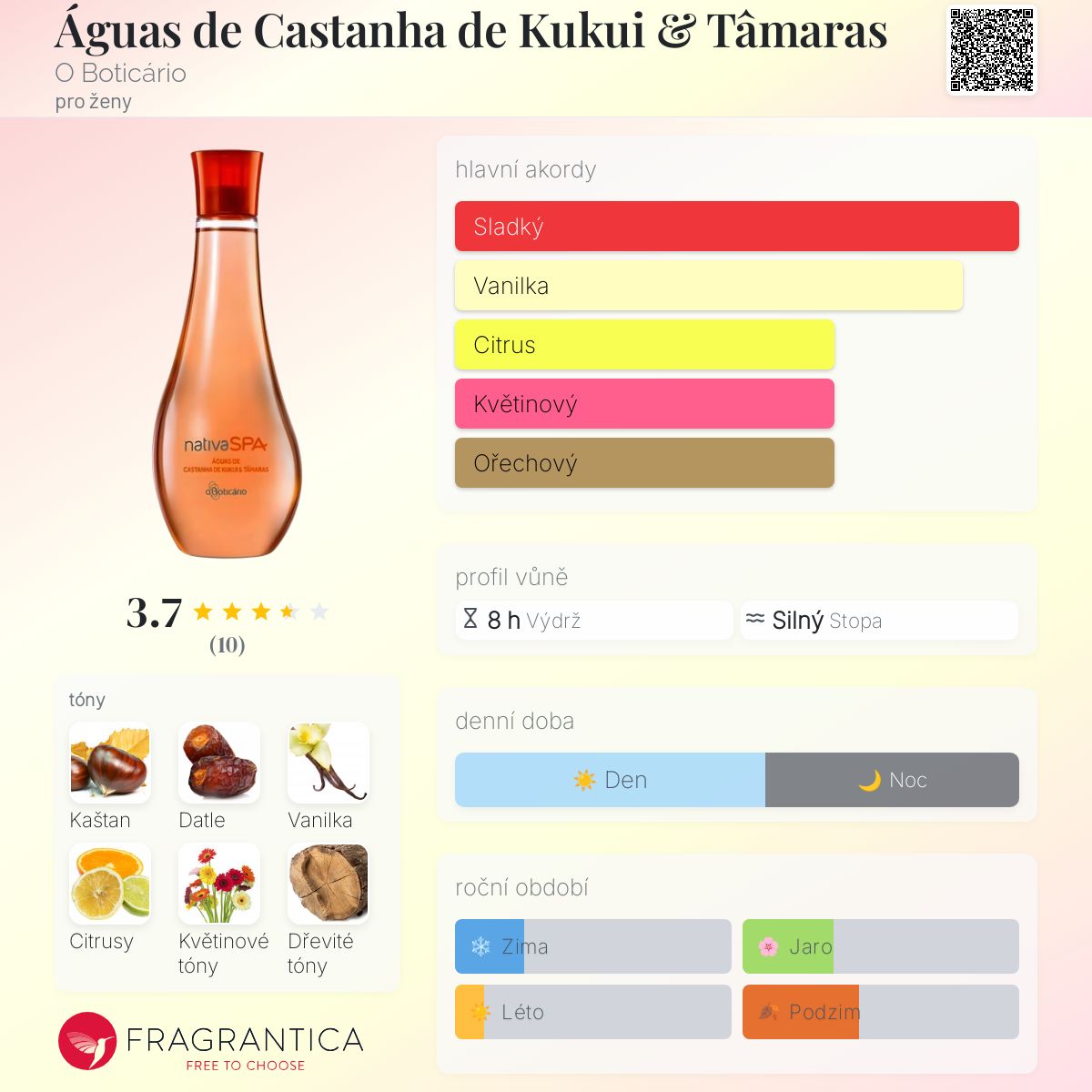 Águas de Castanha de Kukui & Tâmaras podle O Boticário je Citrus Aromatic vůně pro ženy. Águas de Castanha de Kukui & Tâmaras byl/a uveden/a v roce 2017. Vrchní tón je Citrusy ; střední tóny jsouKaštan, Datle a Květinové tóny ; základní tóny jsou Vanilka a Dřevité tóny.