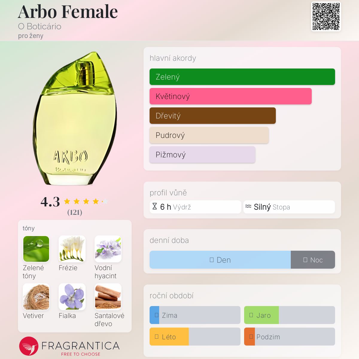 Arbo Female podle O Boticário je Floral Green vůně pro ženy. Vrchní tóny jsou Zelené tóny a Růžový pepř; střední tóny jsouFrézie a Vodní hyacint ; základní tóny jsou Vetiver, Fialka, Santalové dřevo a Pižmo.