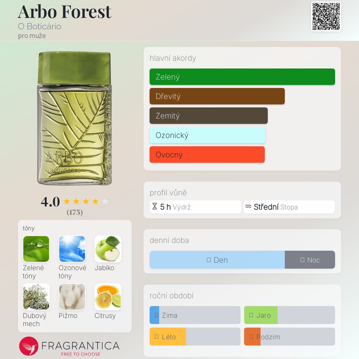 Arbo Forest podle O Boticário je Aromatic Fougere vůně pro muže. Arbo Forest byl/a uveden/a v roce 2022. Arbo Forest byl/a vytvořen/a Marion Costero a Leandro Petit. Vrchní tóny jsou Zelené tóny, Jablko, Citrusy a Levandule; střední tóny jsouOzonové tóny, Cedr, Rebarbora a Fialka ; základní tóny jsou Mech, Pižmo, Vetiver, Pačuli, Jantar (ambra) a Labdanum.
