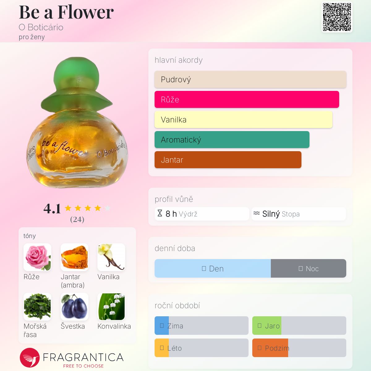 Be a Flower podle O Boticário je Floral Fruity Gourmand vůně pro ženy. Be a Flower byl/a uveden/a v roce 1998. Vrchní tóny jsou Mořská řasa, Švestka, Bergamot a Koriandr; střední tóny jsouRůže, Konvalinka, Otočník a Pelargónie ; základní tóny jsou Jantar (ambra), Vanilka, Santalové dřevo a Pižmo.