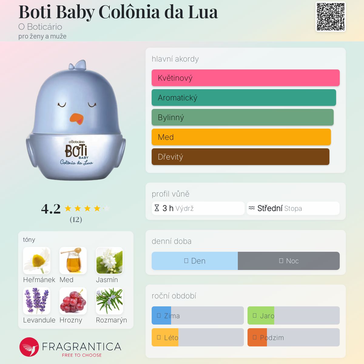 Boti Baby Colônia da Lua podle O Boticário je Floral Woody Musk vůně pro ženy a muže. Boti Baby Colônia da Lua byl/a uveden/a v roce 2018. Vrchní tóny jsou Heřmánek, Med, Levandule, Hrozny, Rozmarýn, Limetka a Citrusy; střední tóny jsouJasmín, Dřevité tóny, Fialka a Růže ; základní tóny jsou Santalové dřevo a Vanilka.