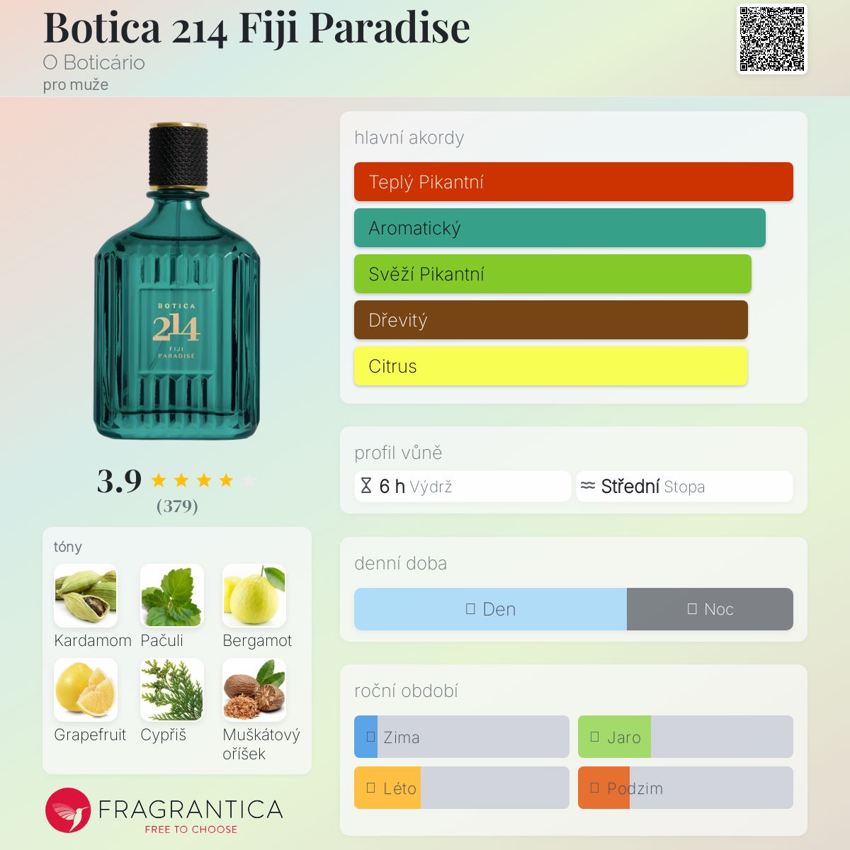 Botica 214 Fiji Paradise podle O Boticário je Aromatic Fougere vůně pro muže. Botica 214 Fiji Paradise byl/a uveden/a v roce 2023. "Nosem" za touto vůní je Christophe Raynaud. Vrchní tóny jsou Kardamom, Bergamot, Grapefruit a Muškátový oříšek; střední tóny jsouCypřiš, Mech, Fialka a Fazole tonka ; základní tóny jsou Pačuli, Jantar (ambra) a Labdanum.