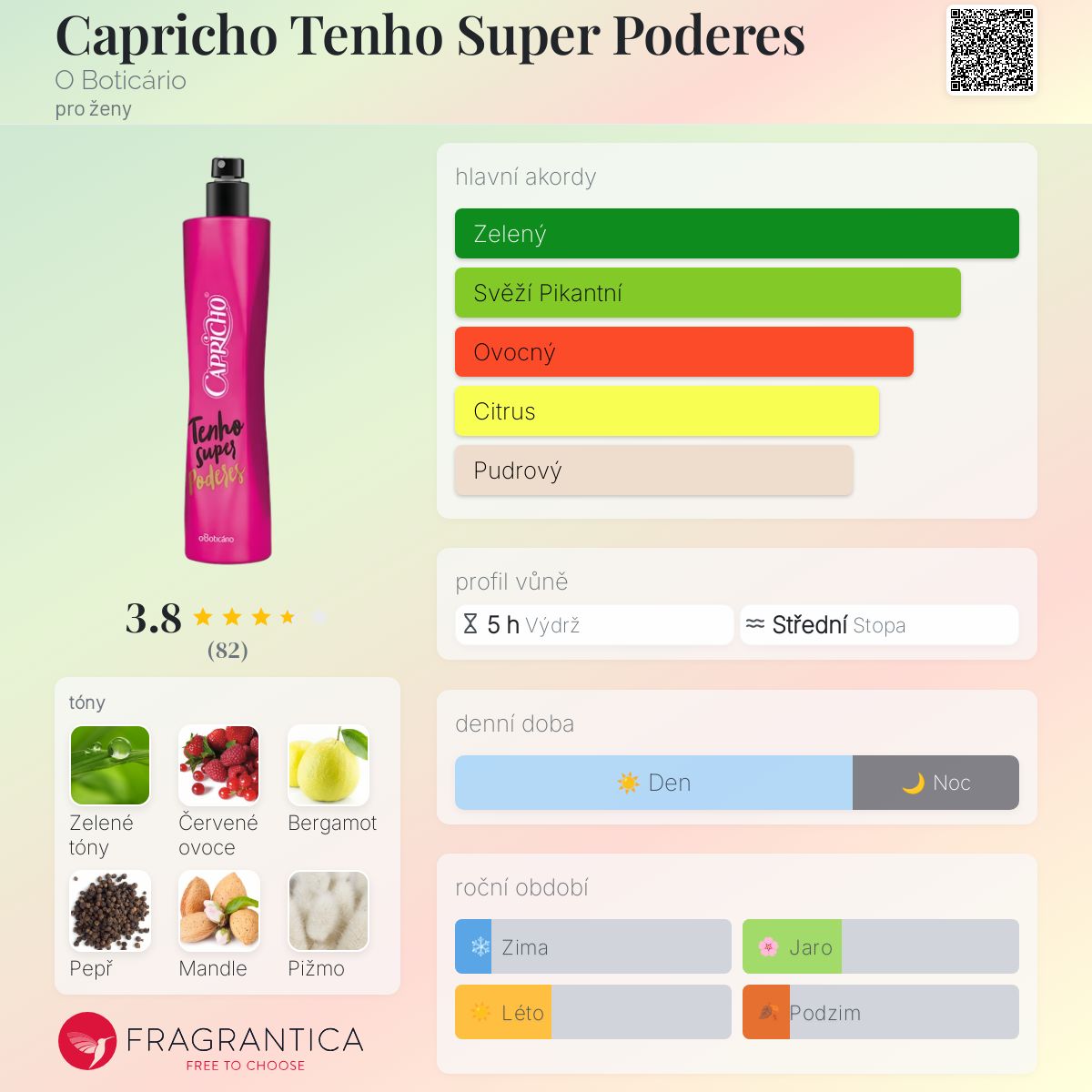 Capricho Tenho Super Poderes podle O Boticário je Floral Fruity vůně pro ženy. Capricho Tenho Super Poderes byl/a uveden/a v roce 2020. Vrchní tóny jsou Zelené tóny, Červené ovoce, Bergamot, Pepř a Máta; střední tóny jsouMandle, Jasmín a Frézie ; základní tóny jsou Pižmo, Vanilka, Cedr, Santalové dřevo a Jantar (ambra).