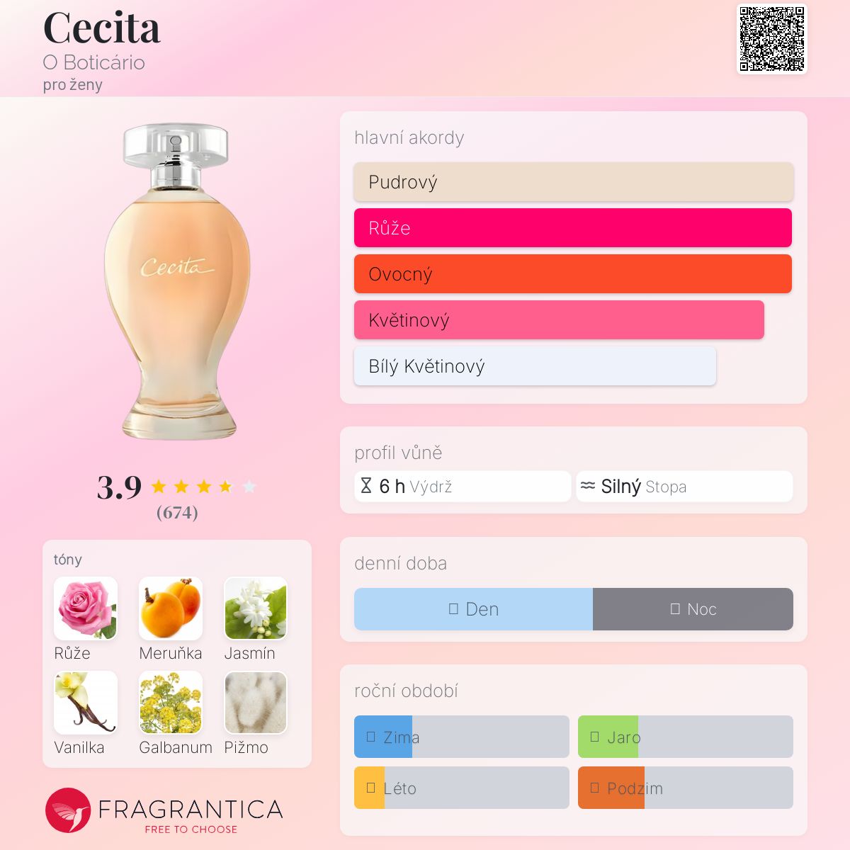 Cecita podle O Boticário je Floral Fruity vůně pro ženy. Cecita byl/a uveden/a v roce 1983. "Nosem" za touto vůní je Olivier Paget. Vrchní tóny jsou Meruňka a Galbanum; střední tóny jsouRůže, Jasmín, Vonokvětka a Pepř ; základní tóny jsou Vanilka, Pižmo a Santalové dřevo.
