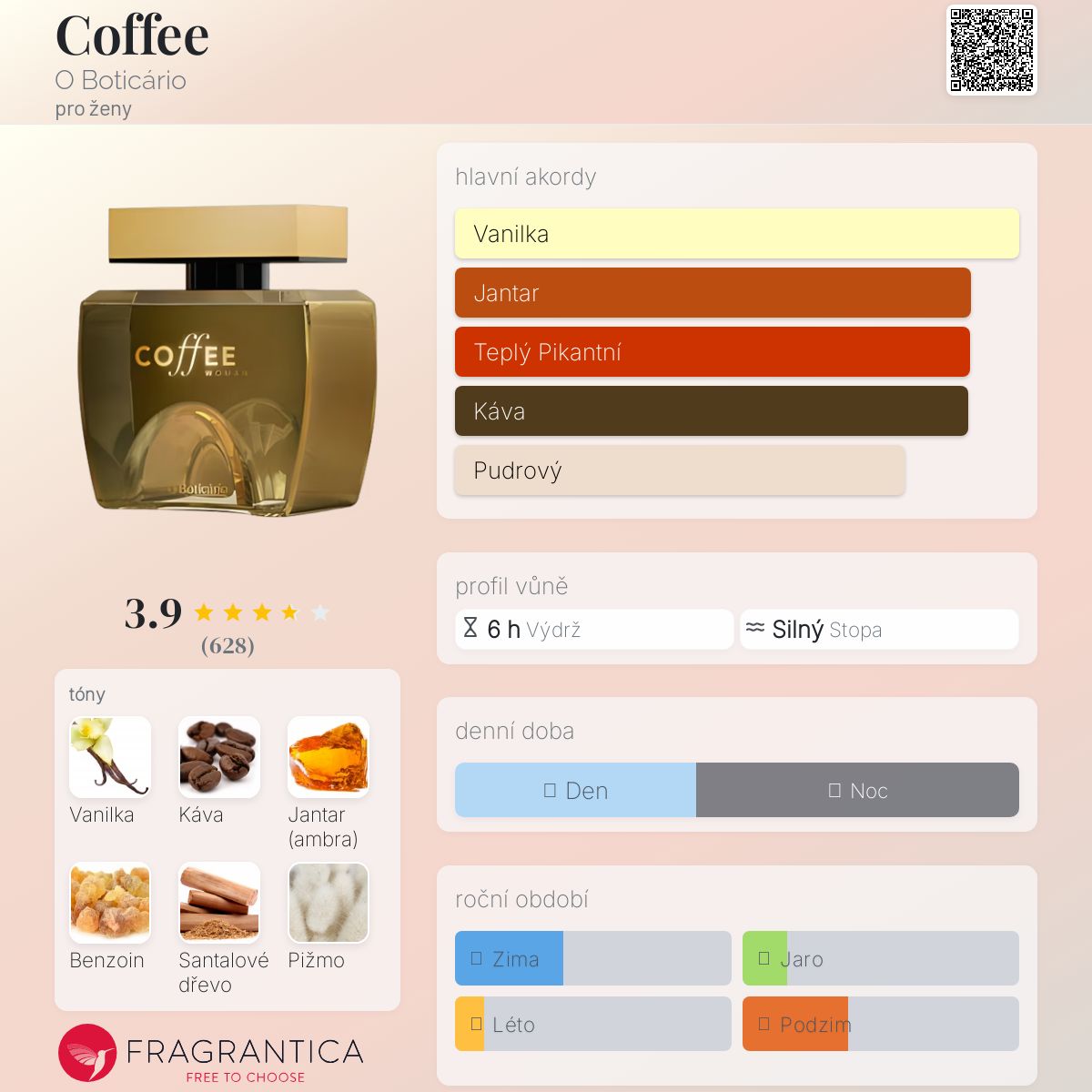 Coffee podle O Boticário je Orientální Vanilla vůně pro ženy. Coffee byla spuštěna během 2000. "Nosem" za touto vůní je Hernan Fígoli. Vrchní tóny jsou Červené jablko, Zelené tóny a Bergamot; střední tóny jsouKáva, Jasmín a Květ afrického pomeranče ; základní tóny jsou Vanilka, Jantar (ambra), Benzoin, Santalové dřevo a Pižmo.