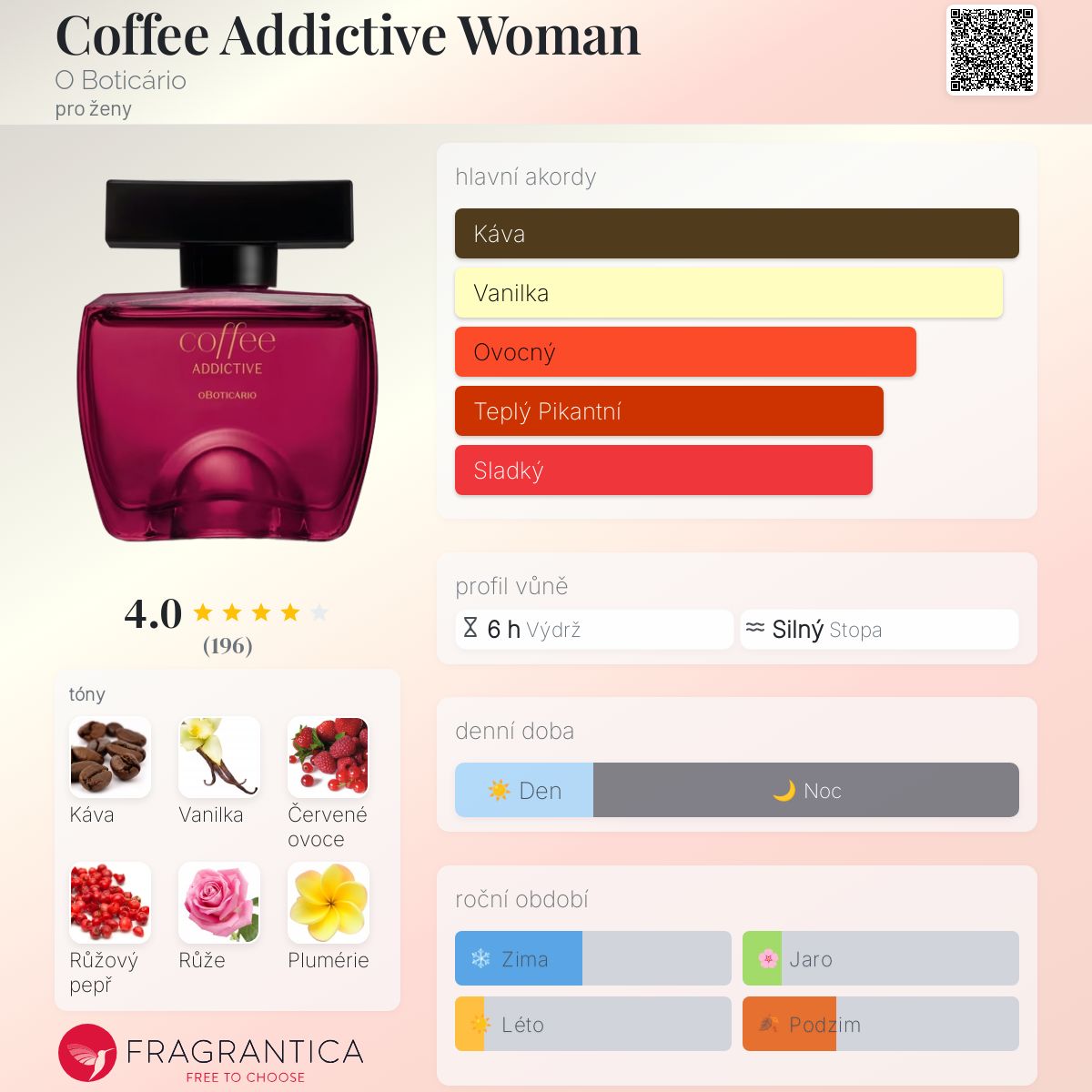 Coffee Addictive Woman podle O Boticário je Orientální vůně pro ženy. Toto je nová vůně. Coffee Addictive Woman byl/a uveden/a v roce 2024. Vrchní tóny jsou Červené ovoce, Růžový pepř a Bergamot; střední tóny jsouRůže, Plumérie a Jasmín ; základní tóny jsou Káva, Vanilka a Červené ovoce.