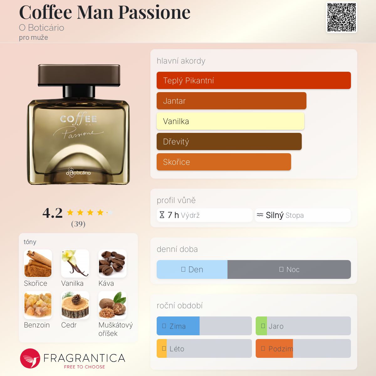 Coffee Man Passione podle O Boticário je Orientální Spicy vůně pro muže. Coffee Man Passione byl/a uveden/a v roce 2013. "Nosem" za touto vůní je Sonia Constant. Vrchní tóny jsou Skořice, Muškátový oříšek, Levandule a Citrusy; střední tóny jsouCedr, Orchidej, Pačuli a Pelargónie ; základní tóny jsou Vanilka, Káva, Benzoin, Jantar (ambra), Dubový mech, Santalové dřevo a Vetiver.