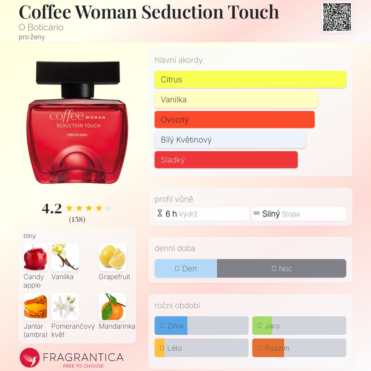 Coffee Woman Seduction Touch podle O Boticário je Orientální Floral vůně pro ženy. Coffee Woman Seduction Touch byl/a uveden/a v roce 2023. Vrchní tóny jsou Sladké jablko, Grapefruit a Mandarinka; střední tóny jsouPomerančový květ, Jasmín a Pivoňka ; základní tóny jsou Vanilka a Jantar (ambra).
