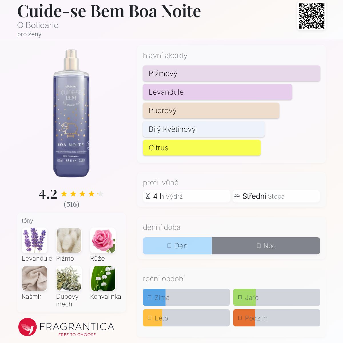 Cuide-se Bem Boa Noite podle O Boticário je Floral Woody Musk vůně pro ženy. Cuide-se Bem Boa Noite byl/a uveden/a v roce 2021. Vrchní tóny jsou Bergamot, Mandarinka, Švestka a Růžový pepř; střední tóny jsouLevandule, Růže, Konvalinka, Jasmín a Sladké tóny ; základní tóny jsou Pižmo, Kašmír, Mech a Jantar (ambra).