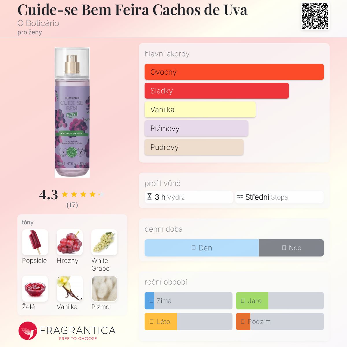 Cuide-se Bem Feira Cachos de Uva podle O Boticário je Floral Fruity vůně pro ženy. Toto je nová vůně. Cuide-se Bem Feira Cachos de Uva byl/a uveden/a v roce 2025. Vrchní tóny jsou Popsicle, Hrozny, Bílé hrozny a Maliny; střední tóny jsouHrozny, Želé, Lesní jahoda, Jasmín a Konvalinka ; základní tóny jsou Vanilka, Pižmo, Jantar (ambra) a Kumarin.