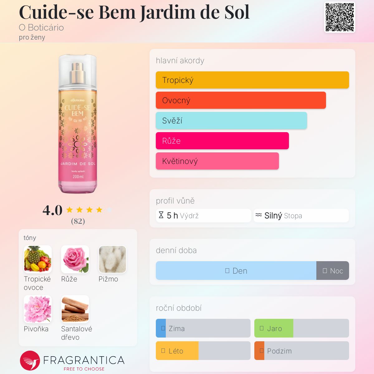 Cuide-se Bem Jardim de Sol podle O Boticário je Floral Fruity vůně pro ženy. Cuide-se Bem Jardim de Sol byl/a uveden/a v roce 2018. Vrchní tón je Tropické ovoce ; střední tóny jsouRůže a Pivoňka ; základní tóny jsou Pižmo a Santalové dřevo.