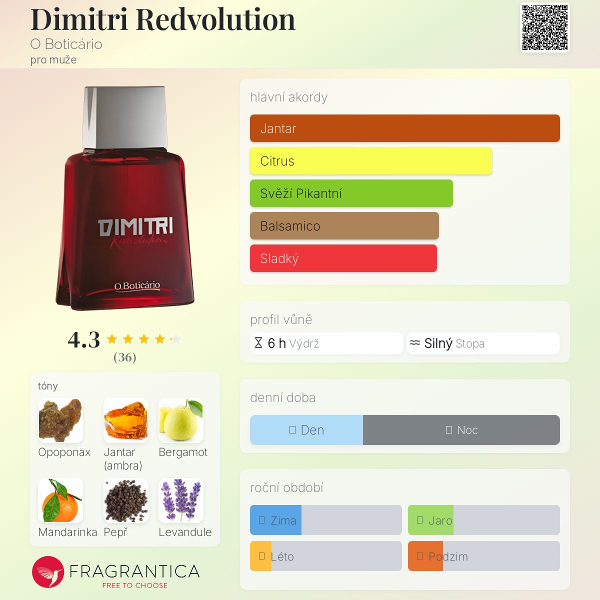 Dimitri Redvolution podle O Boticário je Orientální Woody vůně pro muže. "Nosem" za touto vůní je Sonia Constant. Vrchní tóny jsou Bergamot, Mandarinka a Černý pepř; střední tóny jsouLevandule, Cedr a Kardamom ; základní tóny jsou Opoponax, Jantar (ambra), Pižmo a Pačuli.