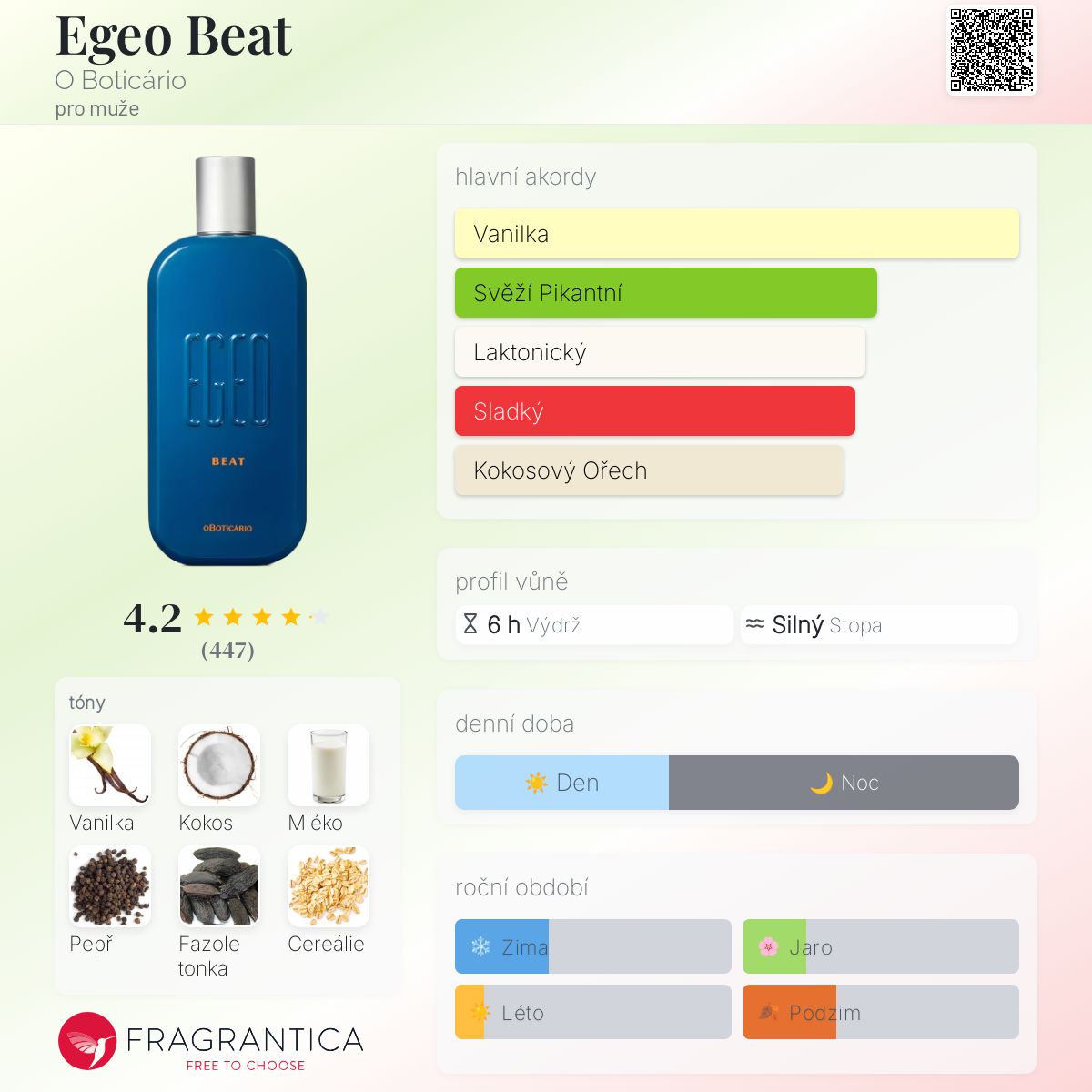 Egeo Beat podle O Boticário je Aromatic Spicy vůně pro muže. Egeo Beat byl/a uveden/a v roce 2021. "Nosem" za touto vůní je Christophe Raynaud. Vrchní tóny jsou Madagaskarský pepř a Mandarinka; střední tóny jsouMléko, Cereálie, Levandule, Oheň a Pelargónie ; základní tóny jsou Vanilka, Kokosové mléko, Fazole tonka a Virginský cedr.