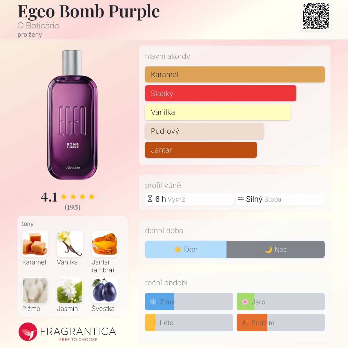 Egeo Bomb Purple podle O Boticário je Orientální Vanilla vůně pro ženy. Egeo Bomb Purple byl/a uveden/a v roce 2019. Vrchní tóny jsou Švestka, Hruška, Mandarinka a Citrón; střední tóny jsouKaramel, Jasmín, Sůl, Kávový květ, Pomerančový květ a Černá orchidej ; základní tóny jsou Vanilka, Jantar (ambra), Pižmo, Cedr a Pačuli.