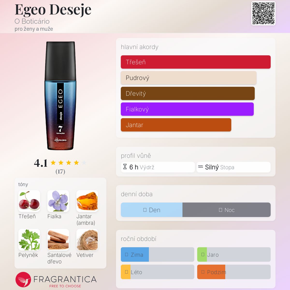 Egeo Deseje podle O Boticário je Orientální Fougere vůně pro ženy a muže. Egeo Deseje byl/a uveden/a v roce 2015. Vrchní tón je Třešňový extrakt ; střední tóny jsouFialka, Pelyněk a Vetiver ; základní tóny jsou Jantar (ambra), Santalové dřevo a Pačuli.