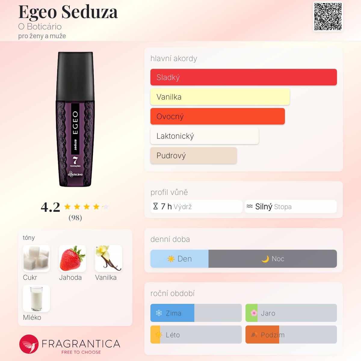 Egeo Seduza podle O Boticário je Floral Fruity Gourmand vůně pro ženy a muže. Egeo Seduza byl/a uveden/a v roce 2015. Vrchní tón je Jahoda ; střední tóny jsouJahoda a Vanilka ; základní tóny jsou Cukr a Mléko.