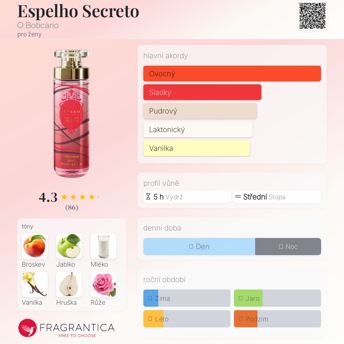 Espelho Secreto podle O Boticário je Floral Fruity vůně pro ženy. Espelho Secreto byl/a uveden/a v roce 2017. Vrchní tóny jsou Broskev, Jablko a Hruška; střední tóny jsouRůže a Santalové dřevo ; základní tóny jsou Mléko, Vanilka, Oheň, Jantar (ambra) a Pižmo.