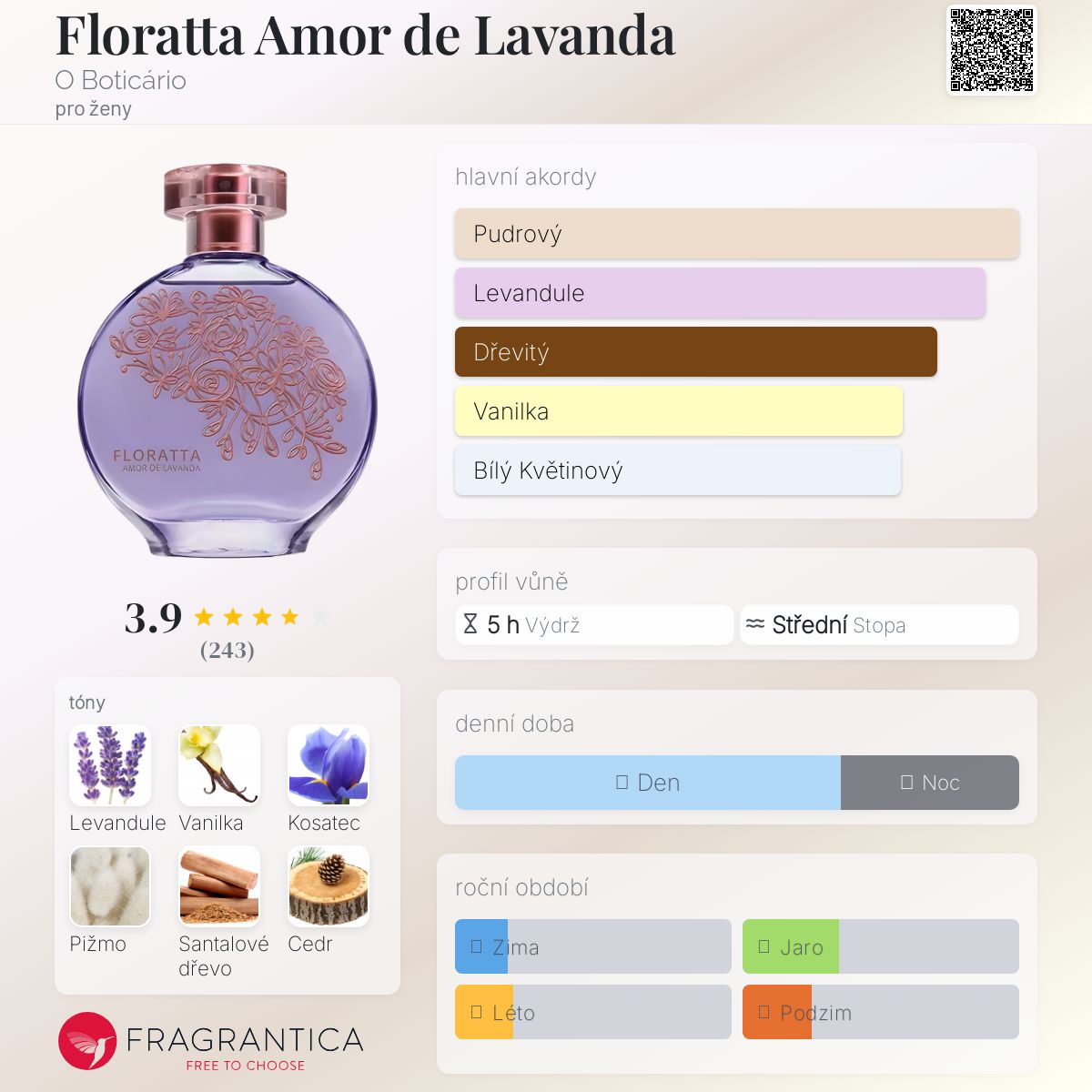 Floratta Amor de Lavanda podle O Boticário je Floral vůně pro ženy. Floratta Amor de Lavanda byl/a uveden/a v roce 2017. Floratta Amor de Lavanda byl/a vytvořen/a Christelle Laprade a Fanny Grau. Vrchní tóny jsou Levandule, Zelené tóny, Mandarinka a Bergamot; střední tóny jsouKosatec, Pivoňka, Zimolez, Jasmín a Konvalinka ; základní tóny jsou Vanilka, Pižmo, Santalové dřevo, Cedr a Pačuli.