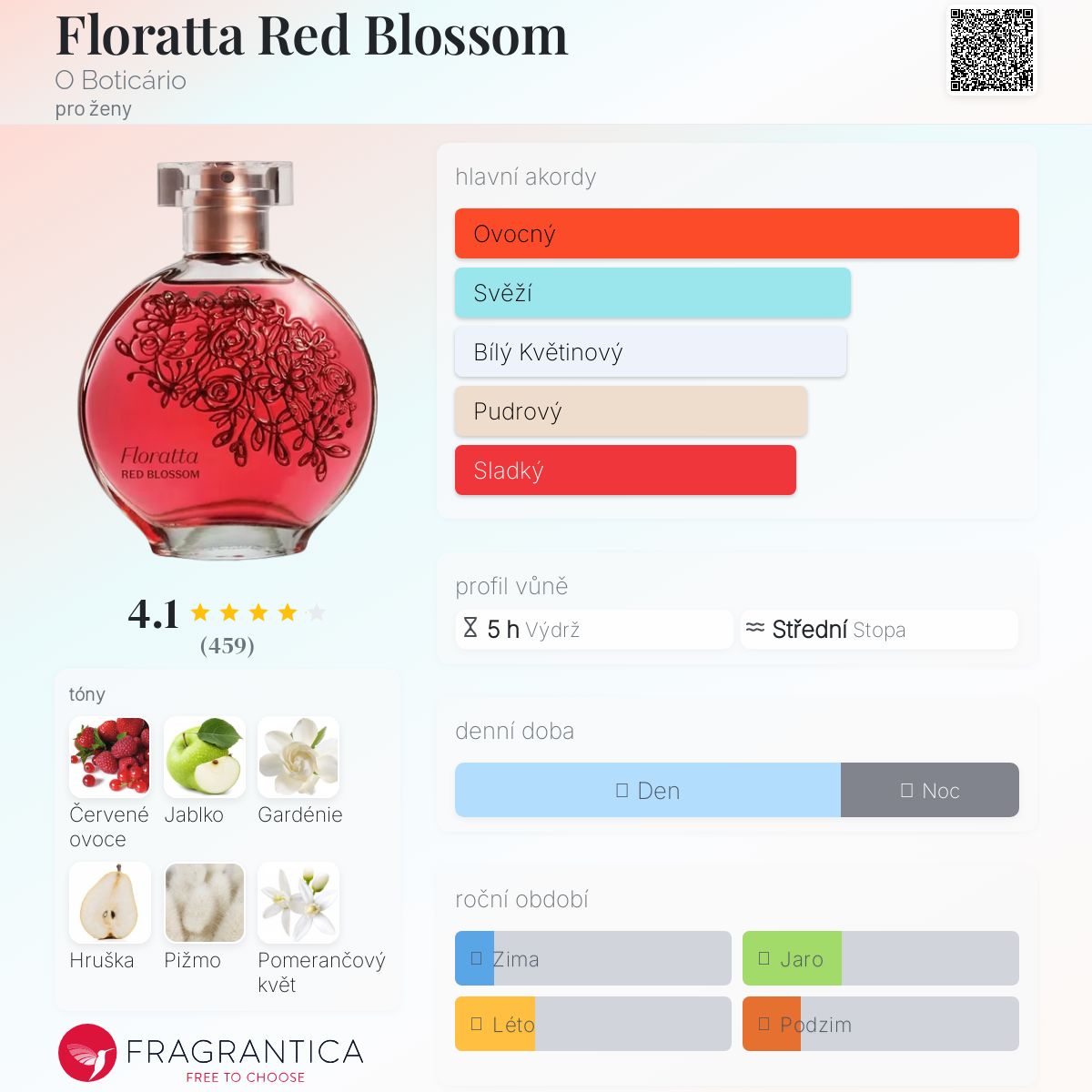 Floratta Red Blossom podle O Boticário je Floral Fruity vůně pro ženy. Floratta Red Blossom byl/a uveden/a v roce 2023. Vrchní tóny jsou Červené ovoce, Jablko, Hruška a Bergamot; střední tóny jsouGardénie, Pomerančový květ a Fialka ; základní tóny jsou Pižmo, Jantar (ambra), Santalové dřevo a Kašmír.