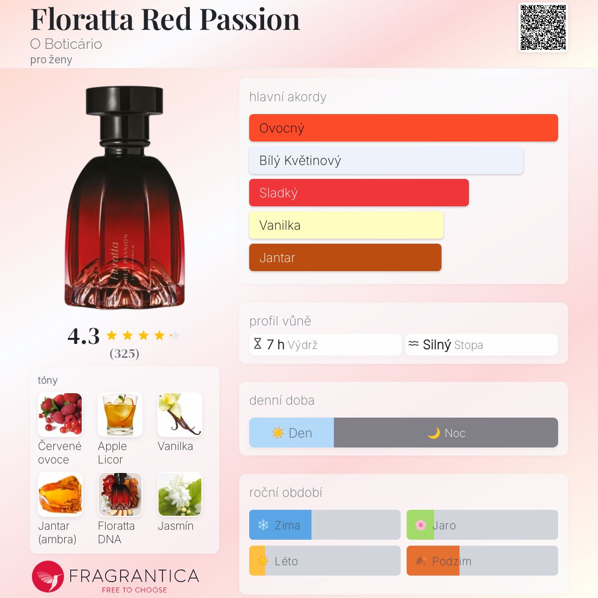 Floratta Red Passion podle O Boticário je Orientální Floral vůně pro ženy. Toto je nová vůně. Floratta Red Passion byl/a uveden/a v roce 2025. "Nosem" za touto vůní je Alienor Massenet. Vrchní tóny jsou Červené ovoce, Hruška a Mandarinka; střední tóny jsouJablečný likér, Floratta DNA, Jasmín, Pomerančový květ a Gardénie ; základní tóny jsou Vanilka, Jantar (ambra) a Santalové dřevo.