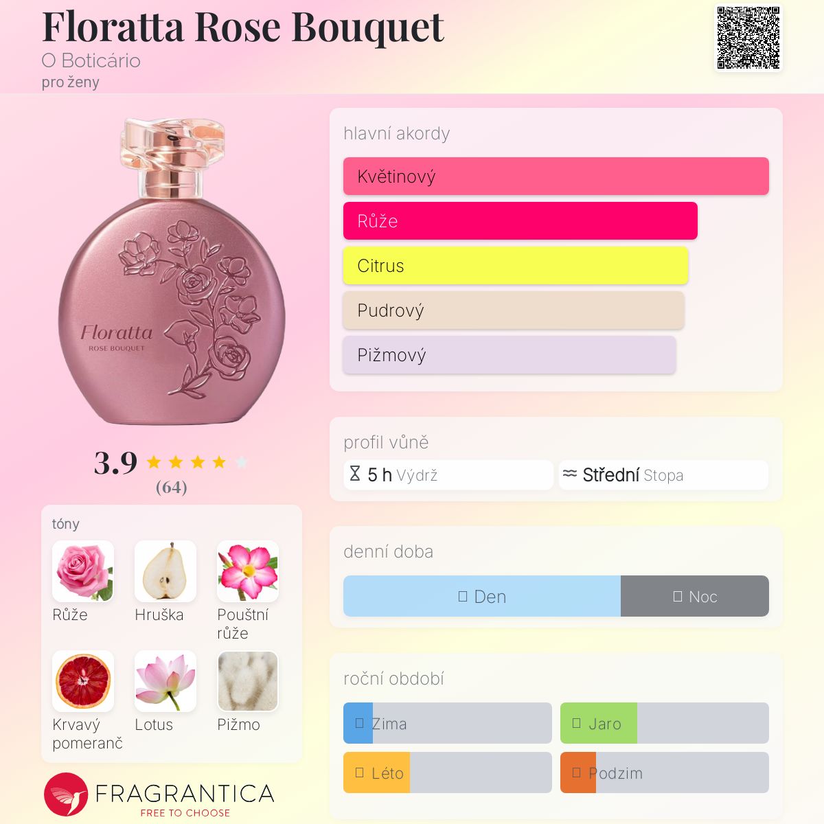 Floratta Rose Bouquet podle O Boticário je Floral vůně pro ženy. Toto je nová vůně. Floratta Rose Bouquet byl/a uveden/a v roce 2025. "Nosem" za touto vůní je Juliette Karagueuzoglou. Vrchní tóny jsou Hruška, Krvavý pomeranč a Sicilský bergamot; střední tóny jsouRůže, Růžová voda, Pouštní růže, Lotus a Semena mrkve ; základní tóny jsou Pižmo, Kašmír, Bílé dřevo, Kosatec a Sinfonide.