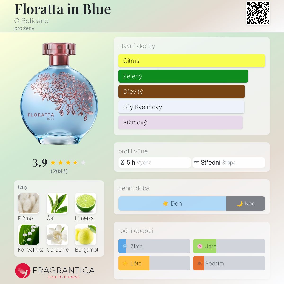 Floratta in Blue podle O Boticário je Floral vůně pro ženy. Floratta in Blue byl/a uveden/a v roce 1998. Floratta in Blue byl/a vytvořen/a Napoleão Bastos a Jean-Marc Chaillan. Vrchní tóny jsou Čaj, Limetka, Bergamot, Pelargónie a Tinktura z růže; střední tóny jsouKonvalinka, Gardénie a Plumérie ; základní tóny jsou Pižmo, Virginský cedr, Santalové dřevo a Vetiver.