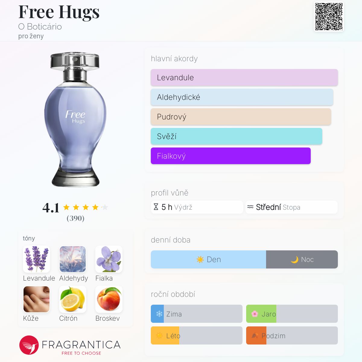 Free Hugs podle O Boticário je Chypre vůně pro ženy. Free Hugs byl/a uveden/a v roce 2020. Vrchní tóny jsou Levandule, Citrón, Broskev, Liči a Mandarinka; střední tóny jsouAldehydy, Fialka, Kůže, Kamélie, Jasmín, Ylang-Ylang a Tuberóza ; základní tóny jsou Santalové dřevo, Pačuli a Benzoin.