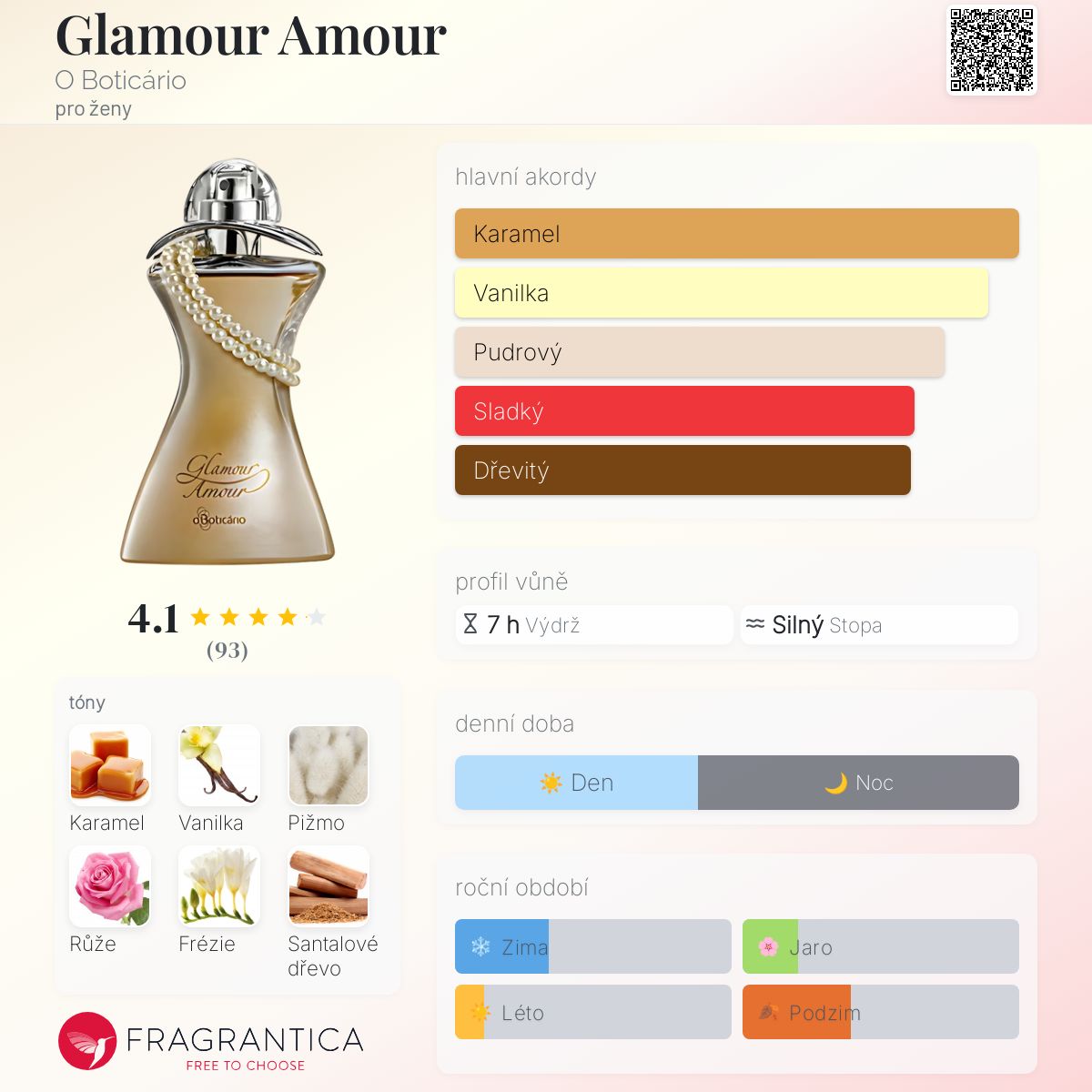 Glamour Amour podle O Boticário je Floral Woody Musk vůně pro ženy. Glamour Amour byl/a uveden/a v roce 2015. Vrchní tóny jsou Frézie, Mandarinka, Lilie, Broskev, Bergamot a Magnólie; střední tóny jsouDamašská růže, Pačuli, Lilie a Cedr ; základní tóny jsou Karamel, Vanilka, Pižmo, Santalové dřevo, Benzoin a Jantar (ambra).