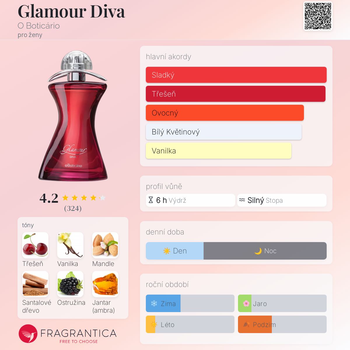 Glamour Diva je opulentní, hustá, sirupovitá a velmi aromatická. Má téměř vše, co potřebuje k dosažení úrovně dokonalosti, kterou si O Boticário udržovalo v polovině 80. a 90. let (nostalgie)!