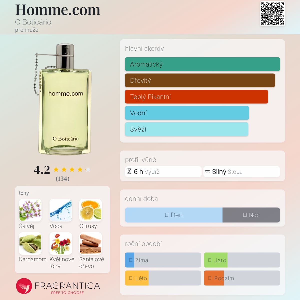 Homme.com podle O Boticário je Citrus Aromatic vůně pro muže. Vrchní tóny jsou Šalvěj, Citrusy, Kardamom a Zelené tóny; střední tóny jsouVodní tóny a Květinové tóny ; základní tóny jsou Santalové dřevo, Pižmo, Virginský cedr a Agarové dřevo (oud).