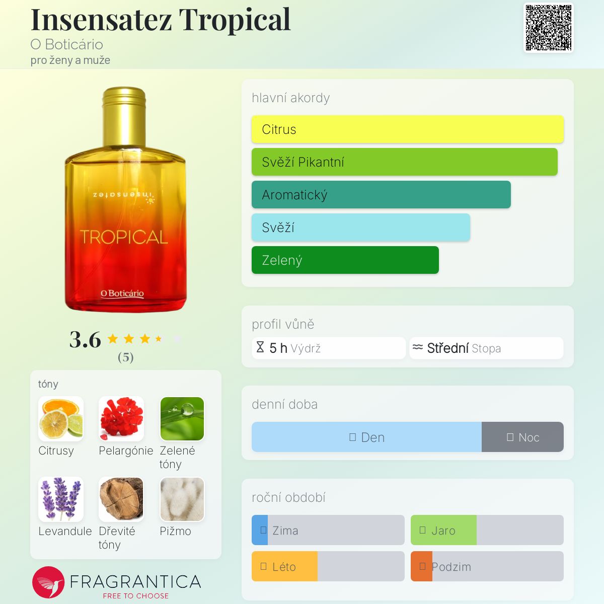 Insensatez Tropical podle O Boticário je Citrus vůně pro ženy a muže. Insensatez Tropical byl/a uveden/a v roce 2013. "Nosem" za touto vůní je Thierry Bessard. Vrchní tóny jsou Citrusy a Zelené tóny; střední tóny jsouPelargónie a Levandule ; základní tóny jsou Dřevité tóny a Pižmo.