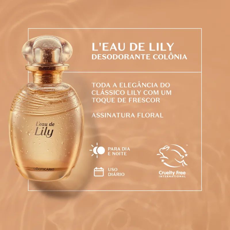 L'eau de Lily podle O Boticário je Floral vůně pro ženy. L'eau de Lily byl/a uveden/a v roce 2021. "Nosem" za touto vůní je Yves Cassar. Vrchní tóny jsou Hruška, Mandarinka, Růžový pepř, Citrón, Zelené jablko a Černý rybíz; střední tóny jsouLilie, Pomerančový květ, Jasmín, Gardénie, Růže a Arum lilie ; základní tóny jsou Pižmo, Vanilka, Jantar (ambra), Santalové dřevo a Mandle.