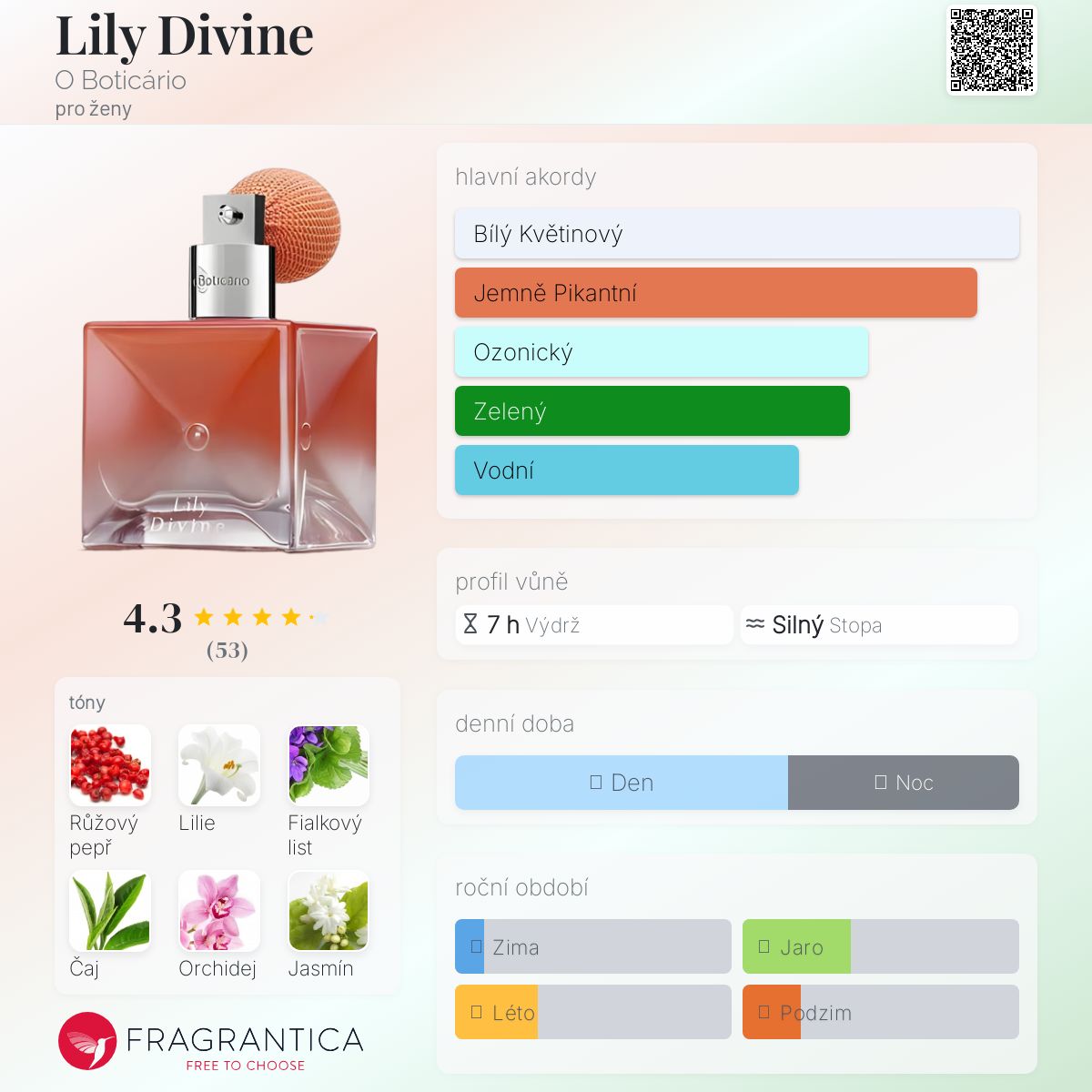 Lily Divine podle O Boticário je Floral vůně pro ženy. Lily Divine byl/a uveden/a v roce 2012. Vrchní tóny jsou Růžový pepř, Červený čaj, Mandarinka a Bergamot; střední tóny jsouLilie, Fialkový list, Černá orchidej, Jasmín a Fík ; základní tóny jsou Santalové dřevo, Jantar (ambra), Vanilka, Pižmo a Peruánský balzám.