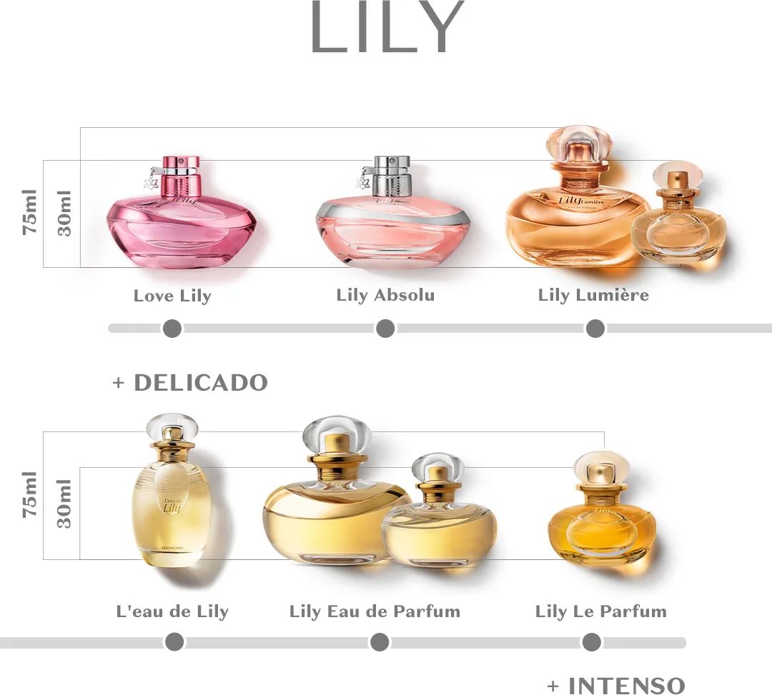 Lily Le Parfum podle O Boticário je Floral vůně pro ženy. Lily Le Parfum byl/a uveden/a v roce 2022. Vrchní tóny jsou Černý rybíz, Mandarinka, Bergamot a Růžový pepř; střední tóny jsouEgyptský jasmín, Gardénie a Narcis ; základní tóny jsou Vanilka, Pižmo, Kašmír, Santalové dřevo a Fazole tonka.