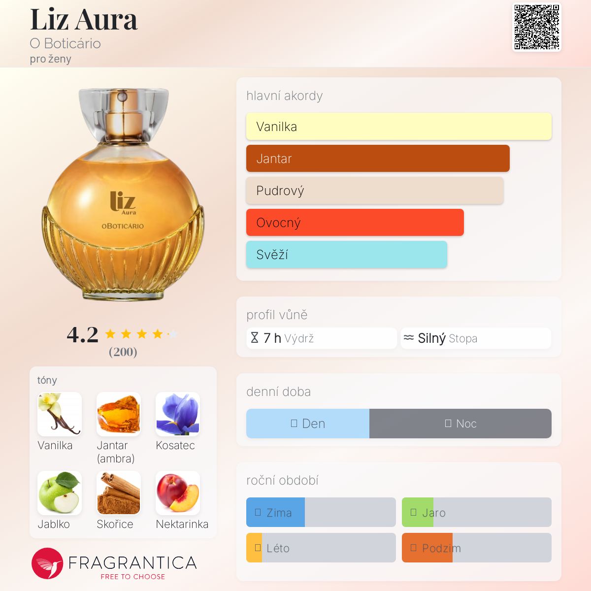 Liz Aura podle O Boticário je Orientální Woody vůně pro ženy. Toto je nová vůně. Liz Aura byl/a uveden/a v roce 2025. "Nosem" za touto vůní je Emilie Coppermann. Vrchní tóny jsou Zelené jablko, Zázvor a Africká pelargonie; střední tóny jsouKosatec, Skořice, Nektarinka a Růže ; základní tóny jsou Madagaskarská vanilka, Jantar (ambra), Mousse de Saxe, Cedar Roots a Labdanum.