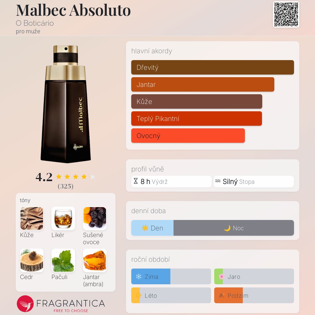 Malbec Absoluto podle O Boticário je Leather vůně pro muže. Malbec Absoluto byl/a uveden/a v roce 2013. "Nosem" za touto vůní je Napoleão Bastos. Vrchní tóny jsou Cedr, Černý pepř, Olibanum, Kardamom, Černý rybíz, Fialkové listy, Bergamot, Citrón, Limetka a Mandarinka; střední tóny jsouLikér, Sušené ovoce, Virginský cedr a List indonéského pačuli ; základní tóny jsou Kůže, Jantar (ambra), Dubový mech, Benzoin a Pižmo.