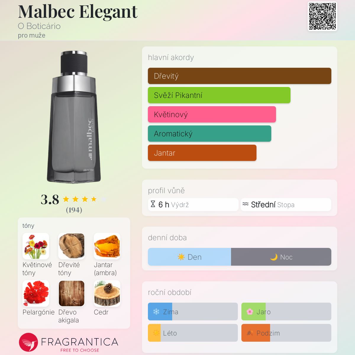 Malbec Elegant podle O Boticário je Woody Floral Musk vůně pro muže. Malbec Elegant byl/a uveden/a v roce 2023. Malbec Elegant byl/a vytvořen/a Christophe Raynaud a Hernan Fígoli. Vrchní tóny jsou Mandarinka, Pepř a Jalovec; střední tóny jsouKvětinové tóny, Dřevité tóny a Pelargónie ; základní tóny jsou Jemný jantar (ambra), Dřevo akigala a Cedr.