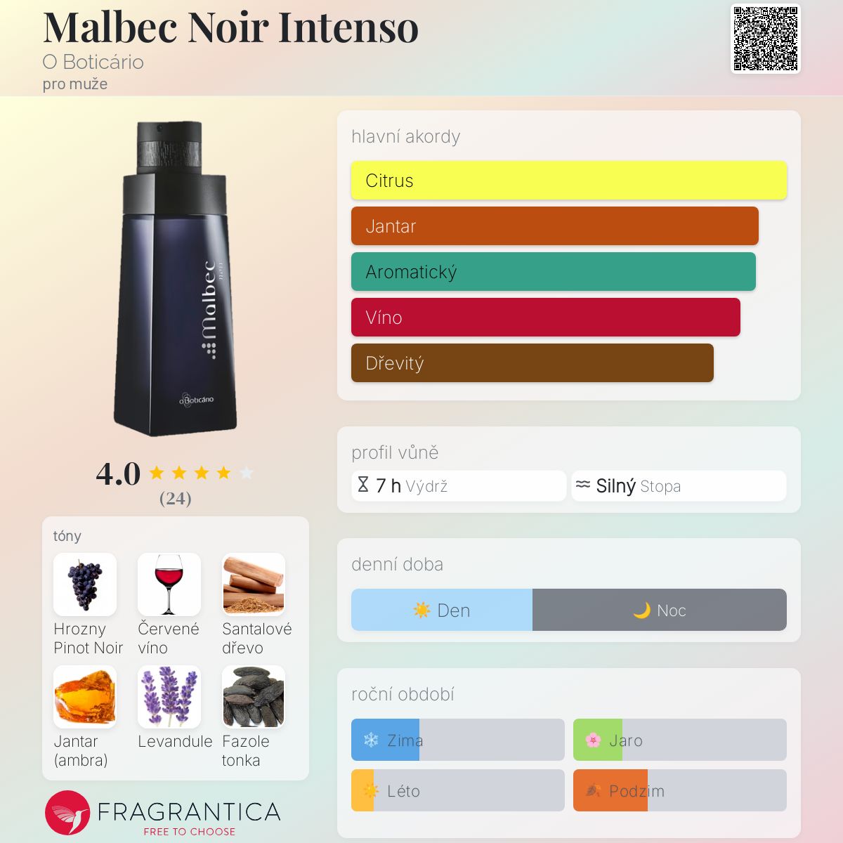 Malbec Noir Intenso podle O Boticário je Aromatic Fougere vůně pro muže. Malbec Noir Intenso byl/a uveden/a v roce 2017. Vrchní tóny jsou Bergamot, Pomeranč a Mandarinka; střední tóny jsouHrozny Pinot Noir, Červené víno, Levandule a Koriandr ; základní tóny jsou Santalové dřevo, Jantar (ambra), Fazole tonka a Pižmo.