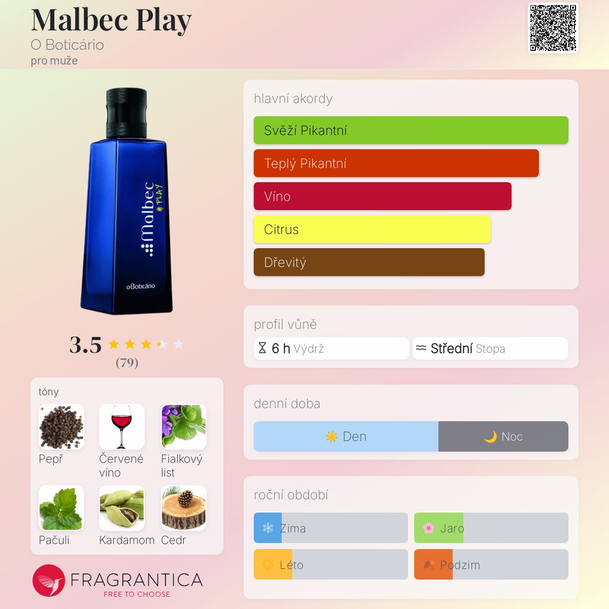 Malbec Play podle O Boticário je Woody Spicy vůně pro muže. Malbec Play byl/a uveden/a v roce 2017. Vrchní tóny jsou Černý pepř, Fialkový list, Kardamom, Limetka, Bergamot, Zelené jablko a Mandarinka; střední tóny jsouČervené víno, Pačuli, Cedr a Levandule ; základní tóny jsou Dubový mech, Jantar (ambra), Benzoin a Pižmo.