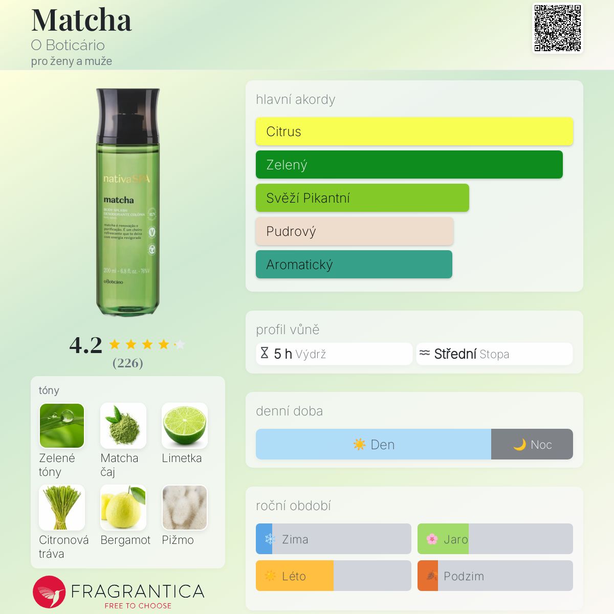 Matcha podle O Boticário je Aromatic Green vůně pro ženy a muže. Matcha byl/a uveden/a v roce 2020. "Nosem" za touto vůní je Marilia Zavisas Duarte. Vrchní tóny jsou Zelené listí, Limetka, Citronová tráva, Kalábrijský bergamot, Yuzu, Pelyněk a Šalvěj; střední tóny jsouMatcha čaj, Hruška, Konvalinka, Levandulový extrakt, Růže a Kardamom ; základní tóny jsou Pižmo, Santalové dřevo, Vanilka a Fazole tonka.
