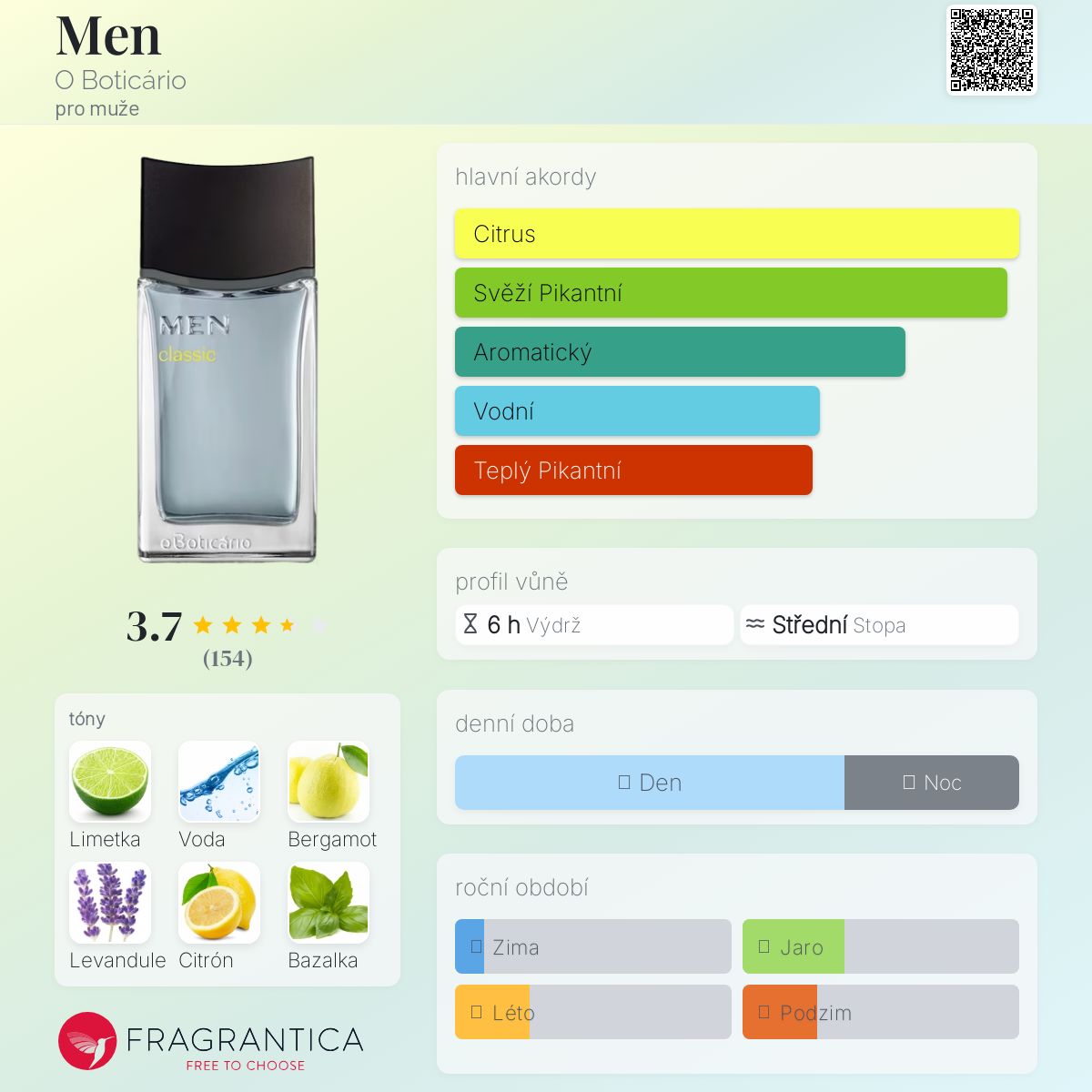 Men podle O Boticário je Woody Aromatic vůně pro muže. Men byl/a uveden/a v roce 2015. "Nosem" za touto vůní je Francisco Marano. Vrchní tóny jsou Limetka, Vodnaté tóny, Bergamot, Sicilský citron, Černý a růžový pepř, Koření a Kardamom; střední tóny jsouLevandule, Bazalka, Fialka, Muškátový oříšek, Pelargónie a Konvalinka ; základní tóny jsou Kůže, Pižmo, Dubový mech, Skalní růže, Jantar (ambra), Labdanum, Santalové dřevo a Kumarin.