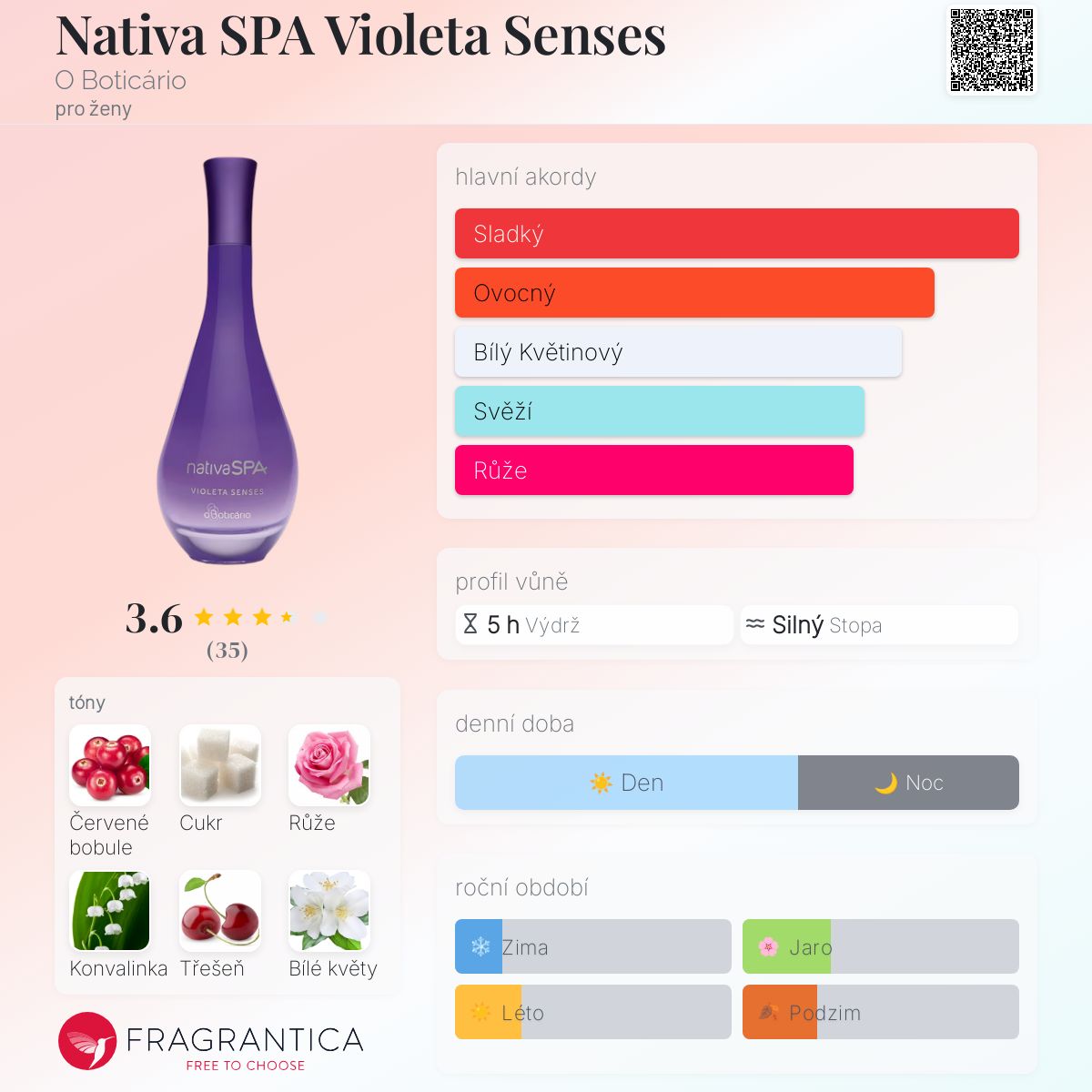Nativa SPA Violeta Senses podle O Boticário je Floral Fruity Gourmand vůně pro ženy. Vrchní tóny jsou Červené bobule a Třešeň; střední tóny jsouRůže, Konvalinka a Bílé květy ; základní tóny jsou Cukr, Santalové dřevo a Jantar (ambra).