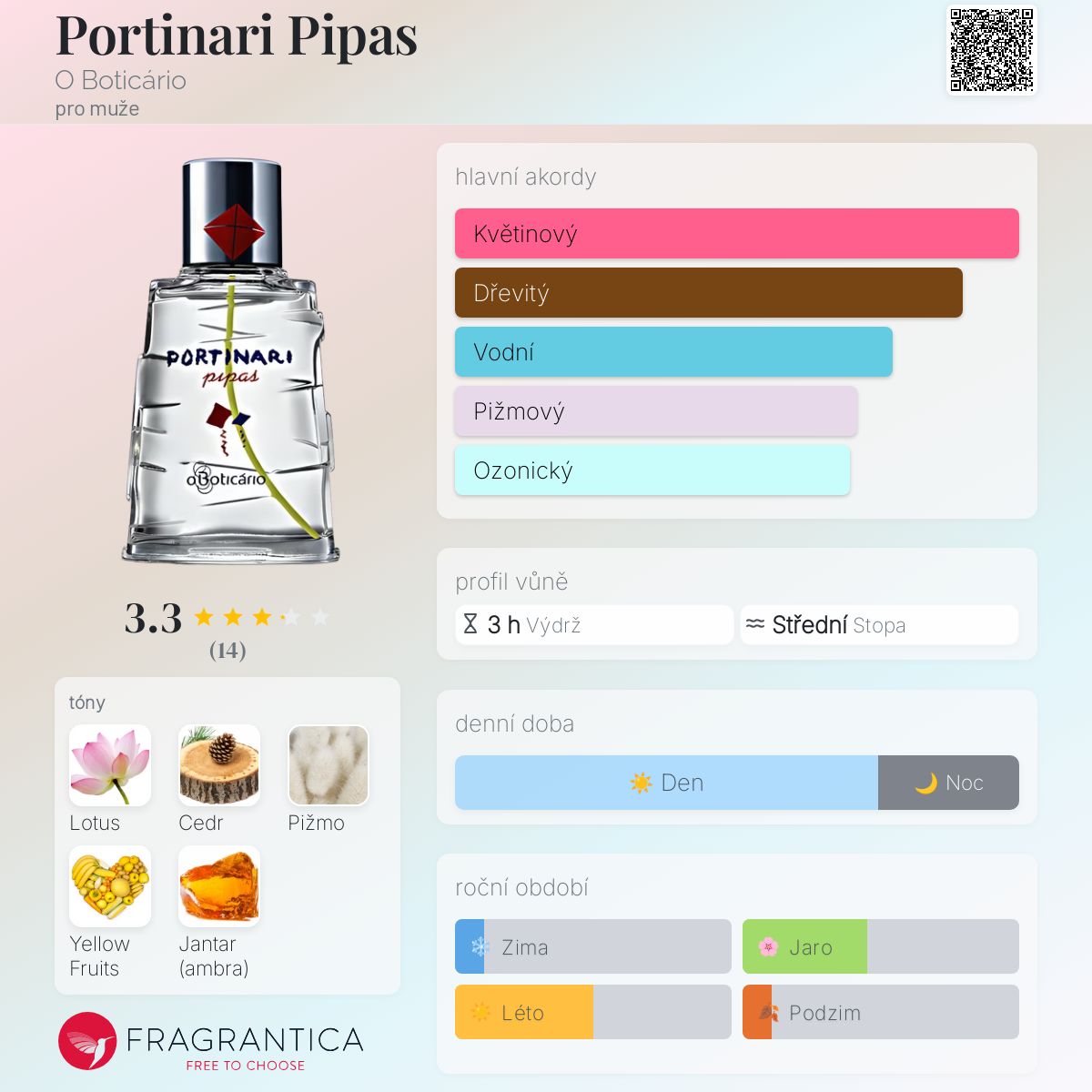 Portinari Pipas podle O Boticário je Aromatic Fougere vůně pro muže. Portinari Pipas byl/a uveden/a v roce 2014. "Nosem" za touto vůní je Verônica Casanova. Vrchní tón je Žluté ovoce ; střední tón jeLotus ; základní tóny jsou Cedr, Pižmo a Jantar (ambra).