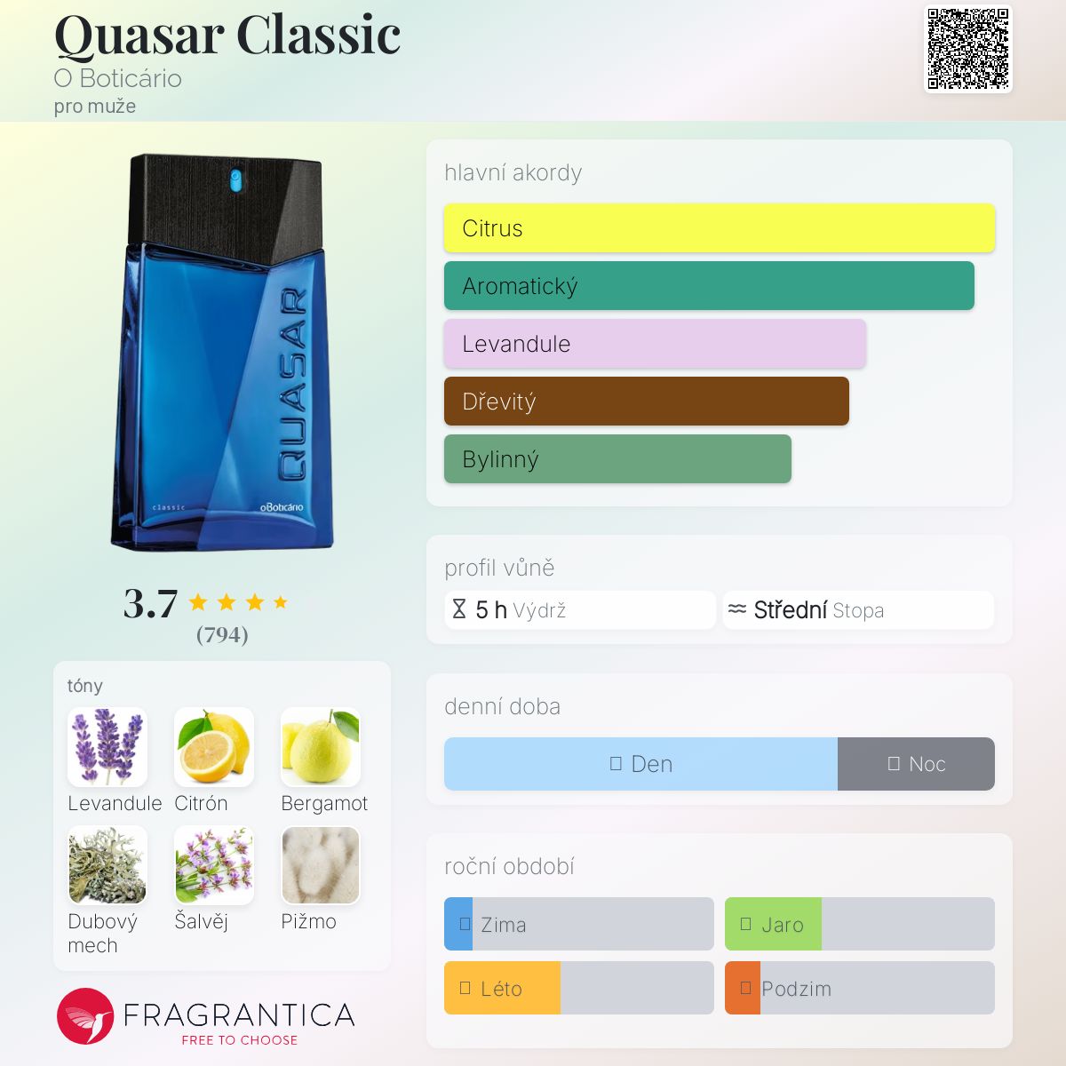 Quasar Classic podle O Boticário je Aromatic Fougere vůně pro muže. Quasar Classic byl/a uveden/a v roce 1990. "Nosem" za touto vůní je Paulo Cesar Fonseca. Vrchní tóny jsou Citrón, Bergamot a Mandarinka; střední tóny jsouLevandule, Šalvěj, Galbanum a Estragon ; základní tóny jsou Dubový mech, Pižmo, Santalové dřevo, Cedr a Pačuli.